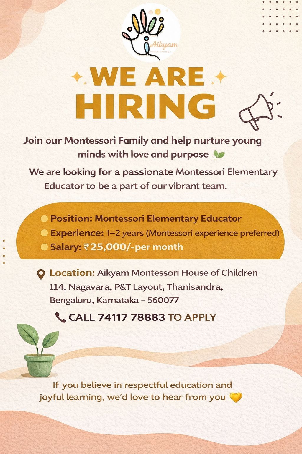 Join our Montessori Family and help nurture young minds with love and purpose. We are looking for a passionate Montessori Elementary Educator to be a part of our vibrant team.